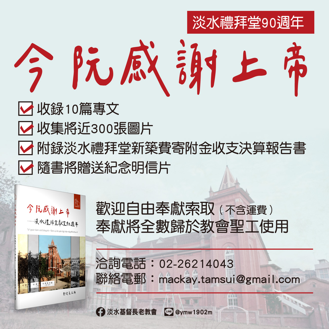 歡迎奉獻《今阮感謝上帝―淡水禮拜堂獻堂90週年》,有意者請洽教會辦公室蘇淑芬幹事。
